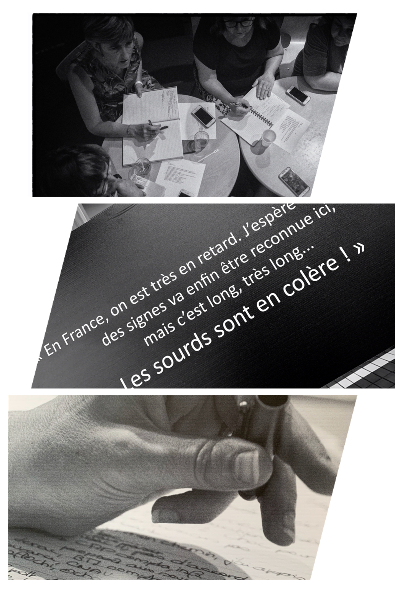 Une série d’interviews a été menée par À mots croisés auprès d’hommes et de femmes, sourds ou entendants, professionnels ou accompagnants. Chacun a raconté son histoire, exprimé ses préoccupations et ses envies. A partir des scripts, des phrases fortes ont été dégagées. Elles sont mises en regard des portraits réalisés par le Photoclub de Bagneux.