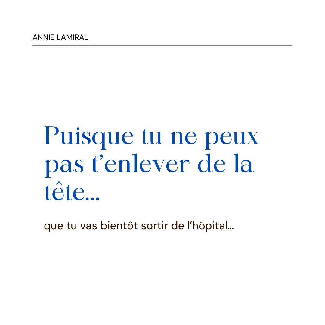 Puisque tu ne peux pas t’enlever de la tête que tu vas bientôt sortir de l’hôpital… sache bien, ma chérie, que les médecins ne peuvent aujourd’hui te le dire. Je leur en ai encore parlé, ce matin. Tout cela est prématuré. Ils envisagent une deuxième opération. Il va te falloir être patiente !