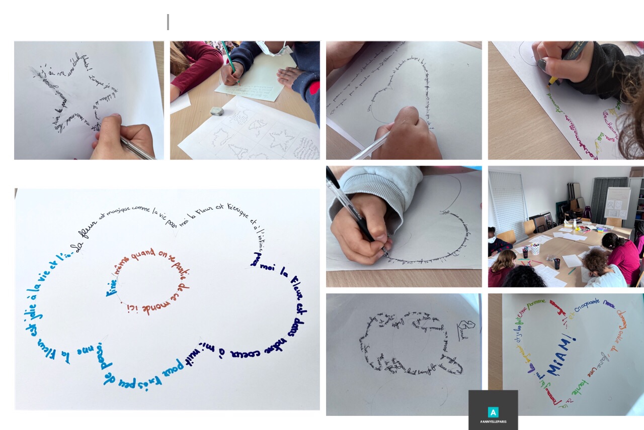 Hanna, Lamia, Sarah, Talya et Olive-Dalya ont ainsi pu découvrir une forme d’écriture très originale : le calligramme*. Après quelques explications sur ces poèmes graphiques, Annie, l’animatrice d’A Mots croisés, les a invitées à choisir une illustration et à imaginer une phrase (ou plusieurs), voire écrire un petit poème en rapport avec le dessin. Deux adultes de passage, Djema et Youmna, ont rejoint le petit groupe. Trop envie d’écrire et de se prêter elles-aussi à l’exercice !