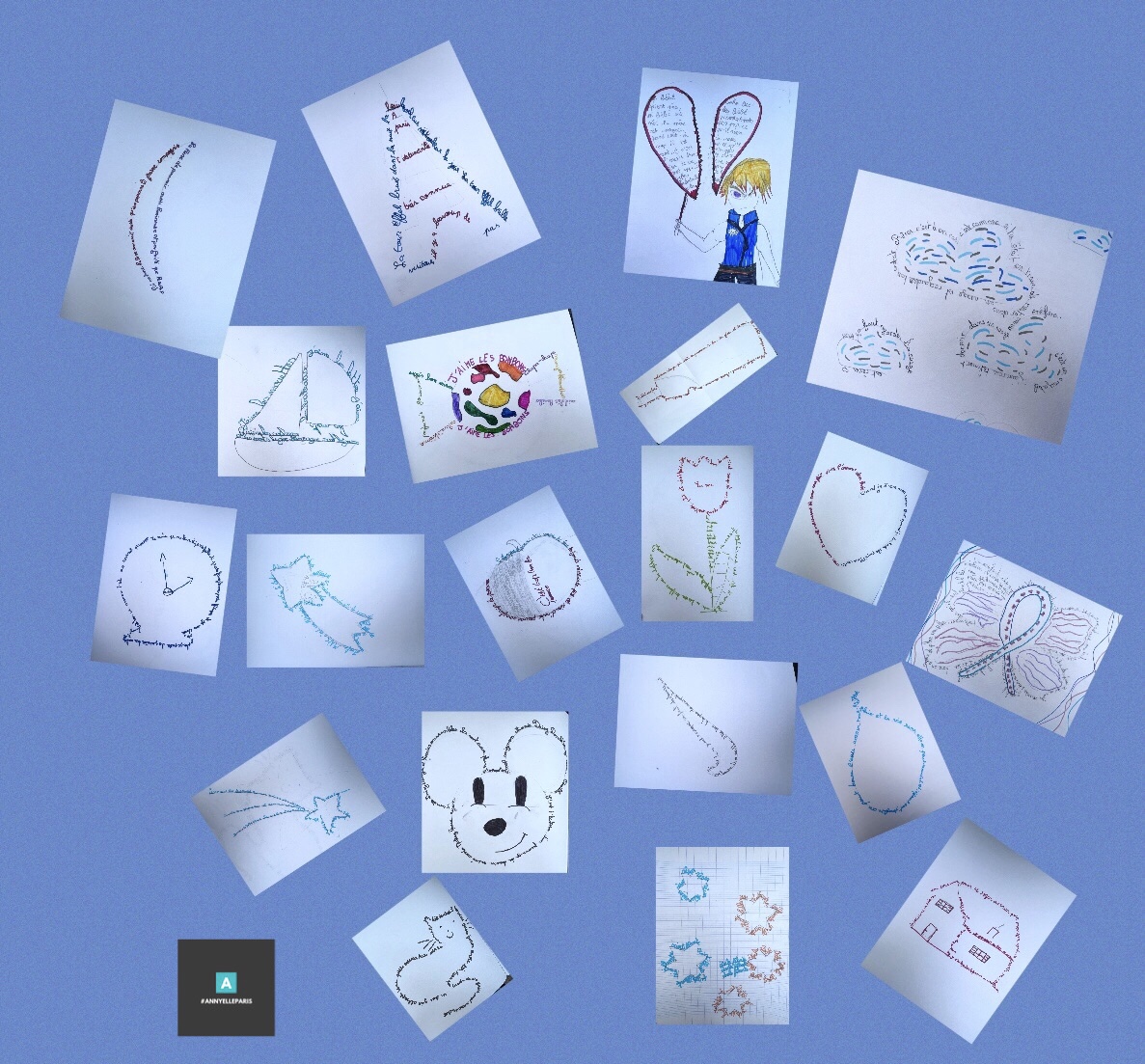 A lire, demain, les calligrammes de Ahmed, Kaïs, Louis, Kyladati, Prefina, Matthieu, Anya, Salma, Louna, Abdoullad, Kaydan et Yacin.