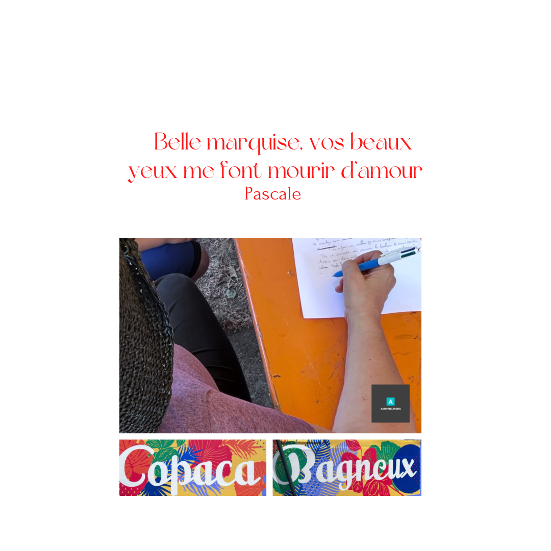 Heureuse d’avoir pris le temps d’écrire avec nous la semaine dernière (voir récit « Rêve de médaille »), Pascale est re-venue à pied de Châtillon pour participer à notre animation ! Elle s’est vite fait sienne l’une de nos propositions d’écriture : Utiliser en incipit le célèbre vers du Bourgeois gentilhomme : « Belle marquise, vos beaux yeux me font mourir d’amour ! ». Bonne lecture !