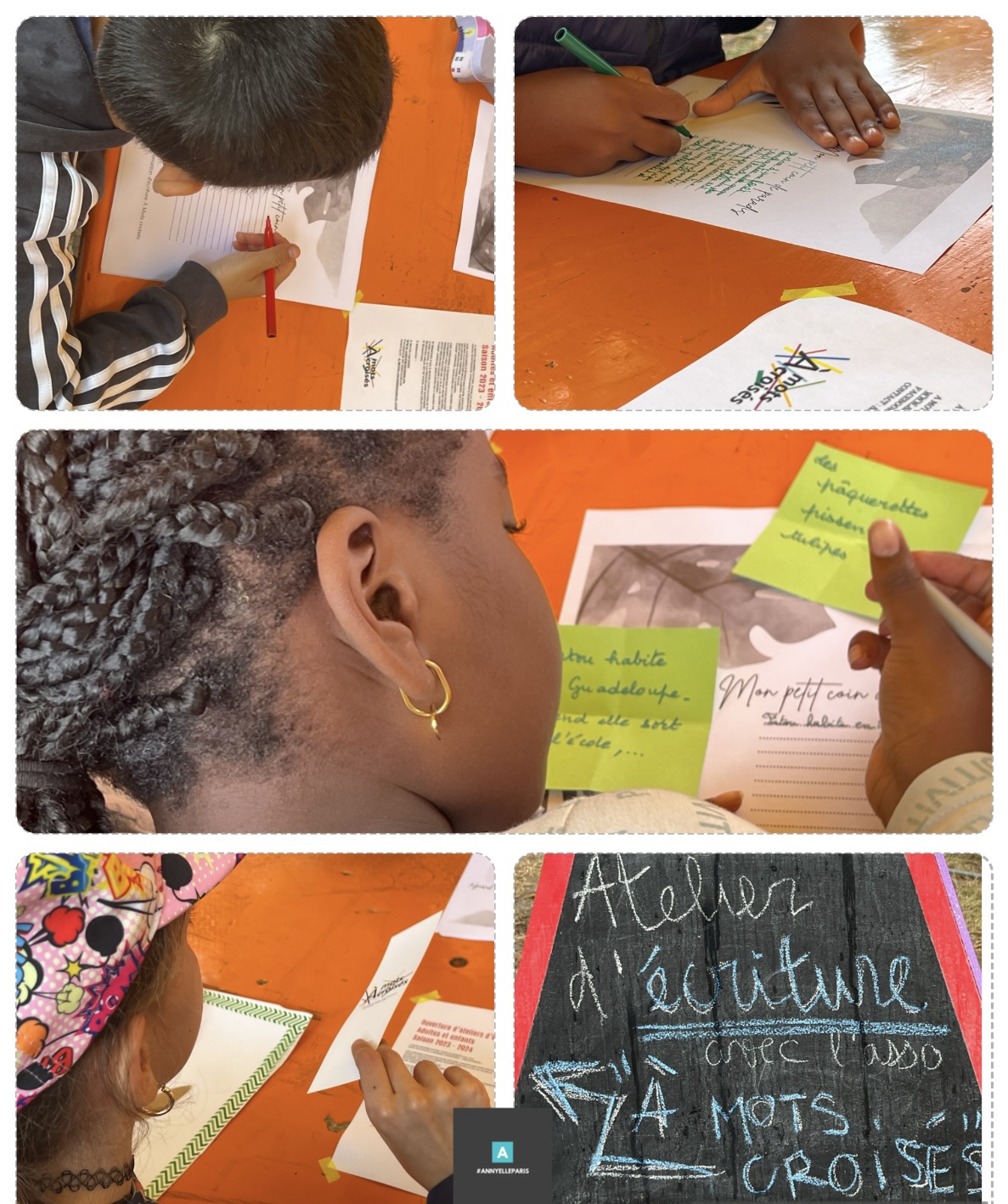 Jeudi 27 juillet après-midi au parc du Puits Saint-Etienne, Annie et Nathalie d’À Mots croisés accueillaient sous une tente multicolore quelques visiteurs, ravis d’oublier la pluie pour imaginer des histoires en lien avec le thème : « Le jour le plus vert » de « Viva Copaca’ Bagneux ».