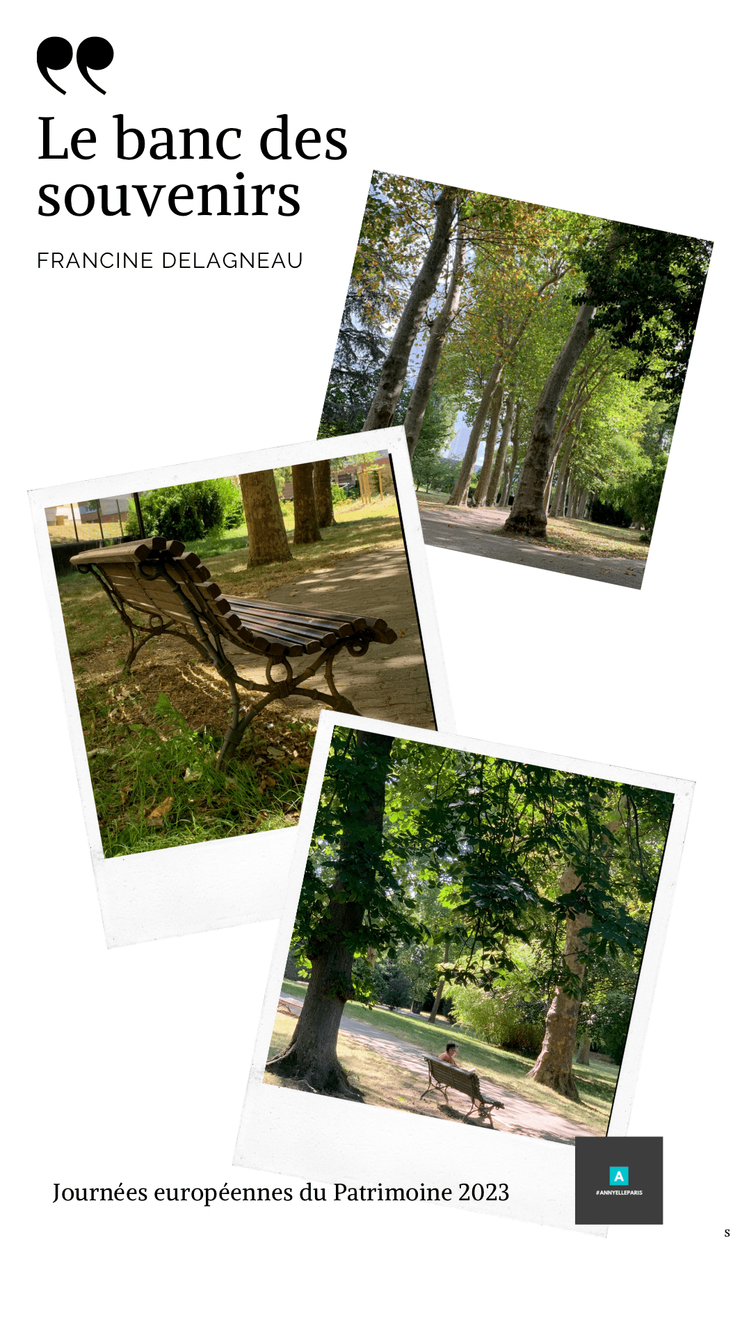 A présent, après toutes ces années, je viens m’asseoir, caresser ton bois et te dire un petit bonjour. Je m’excuse de ne pas être venue te voir depuis si longtemps. Ma vie a été bien remplie, elle m’a éloignée de toi, mais pas de mes pensées. Je ferme les yeux et ensemble ouvrons l’album de nos souvenirs, revoyons les images du bonheur ; les goûters de Maman, les jeux avec les copains, les lèvres de mon premier amoureux, les pages de mes livres, les larmes de mes petits chagrins, le visage de Rodolphe, la blancheur de ma robe. Aujourd’hui, je suis venue créer de nouveaux souvenirs avec toi et te présenter mes petits-enfants.