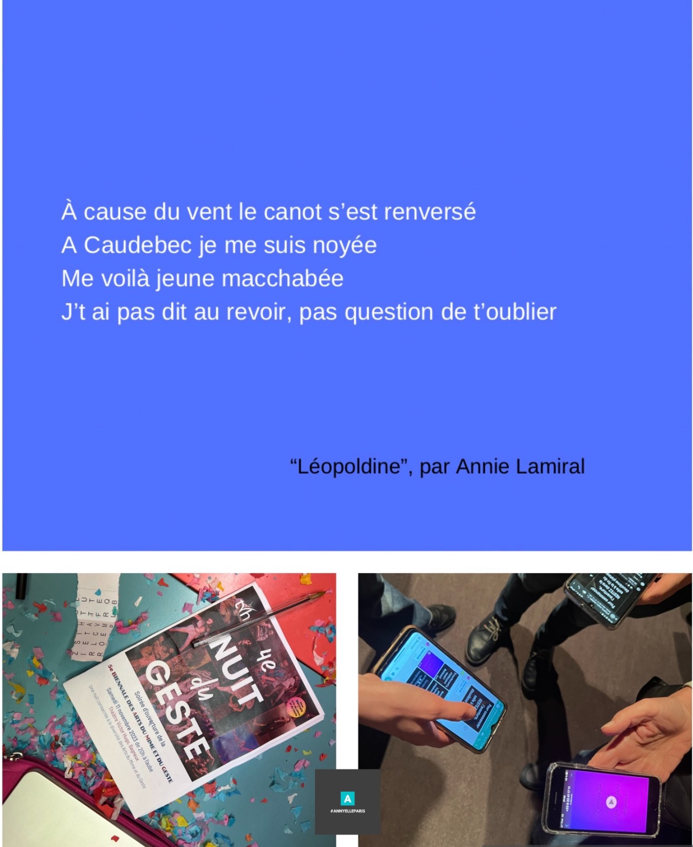 Hier, nous vous avons raconté le dispositif transmédia que nous avons imaginé pour la « Nuit du Geste » au Théâtre Victor Hugo et qui y a été présenté par Arianna Fernandez Grossocordón, metteuse en scène de la compagnie Societat Valentinas et ses comédiens.