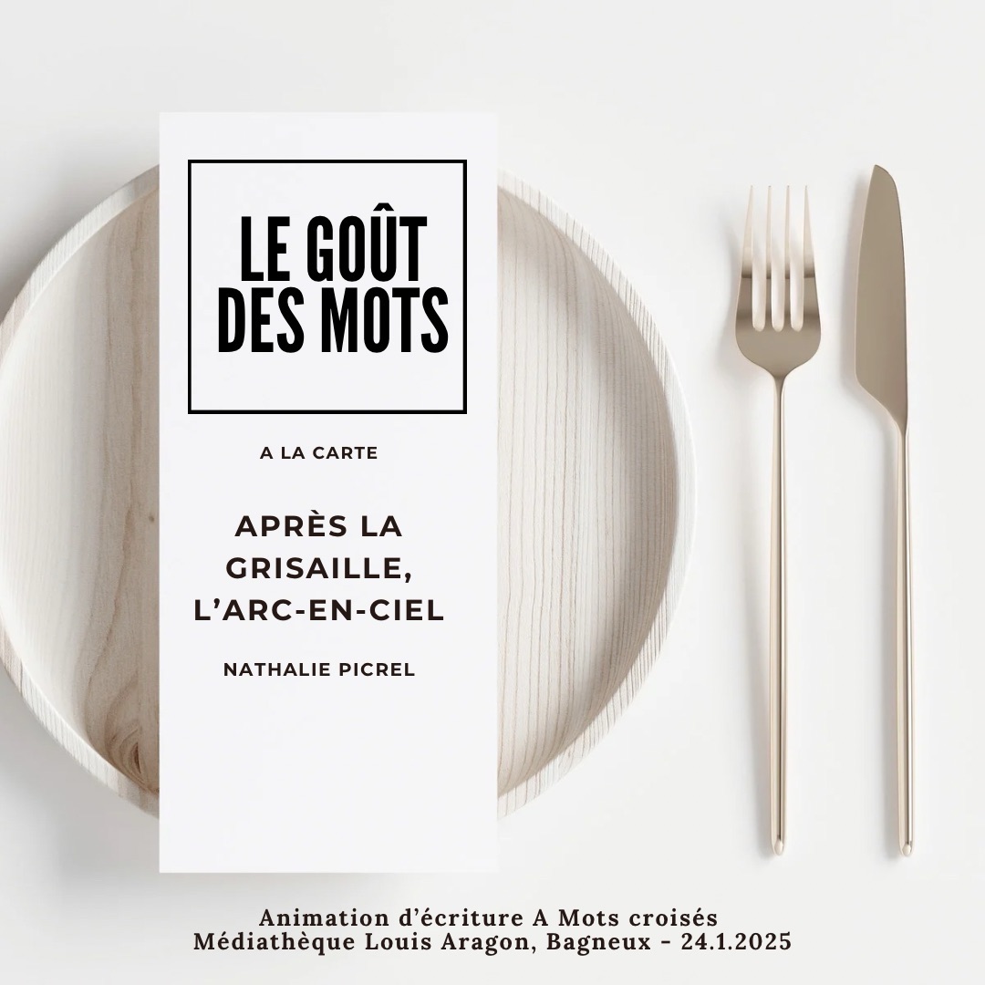 Pour l’occasion, À Mots croisés a proposé, vendredi 24 janvier 2025, un atelier d’écriture « Le goût des mots » animé par Annie Lamiral qui avait préparé des propositions d’écriture pour tous les goûts. Nous vous laissons tout au plaisir de savourer quelques moments au restaurant, imaginés par Nathalie !