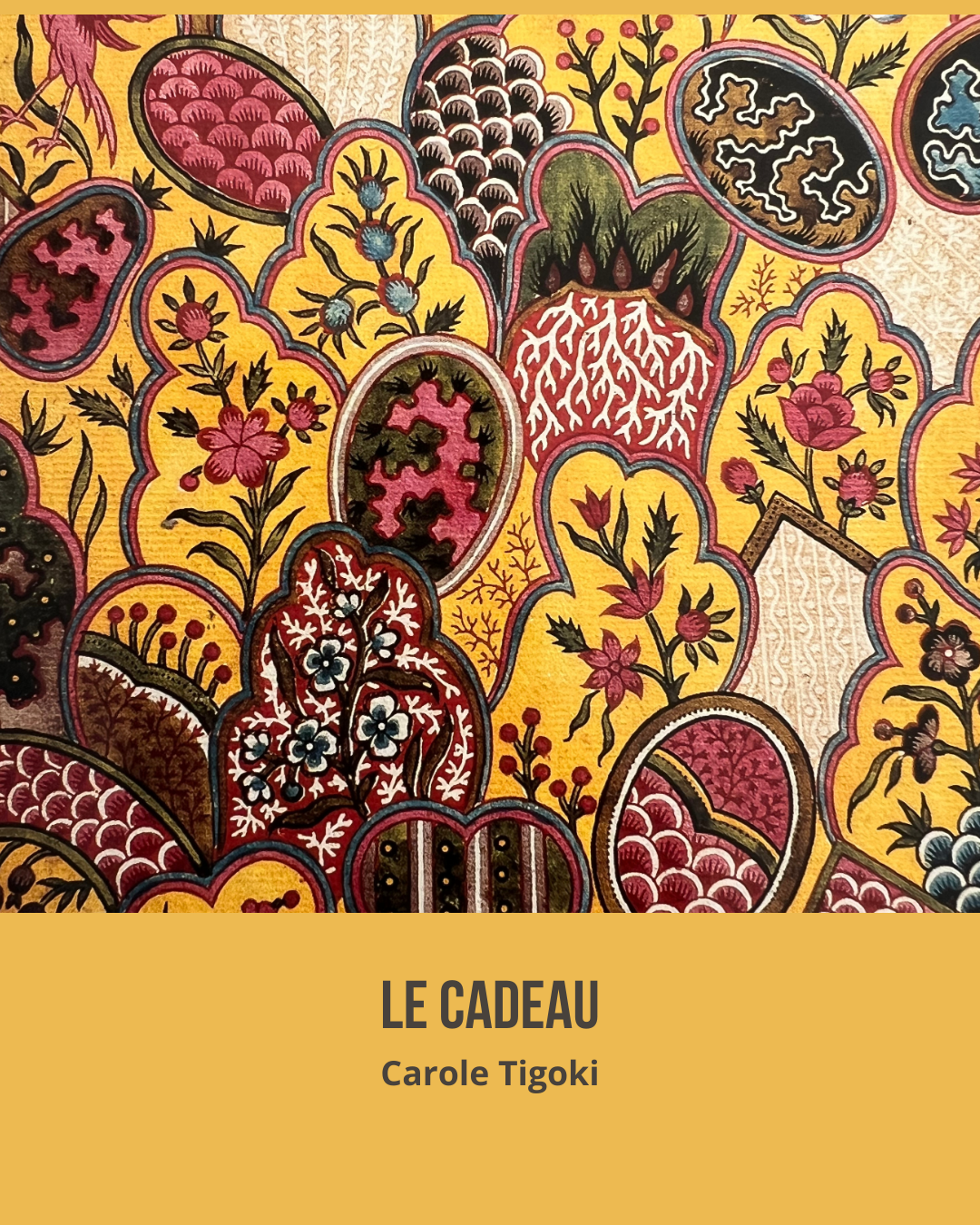 J’observais l’étoffe de long en large, essayant de comprendre les motifs, le dégradé de couleur. Ces formes abstraites aux coloris floraux et fruits ne me plaisaient définitivement pas, ni cette couleur jaune dominante. J’aurais aimé des scènes galantes : une femme au parapluie, un chasseur qui regarde le gibier, des enfants poursuivant un cerf, dans un subtil camaïeu de bleu, rouge, brun, noir jaune. J’en fis part à Camille.