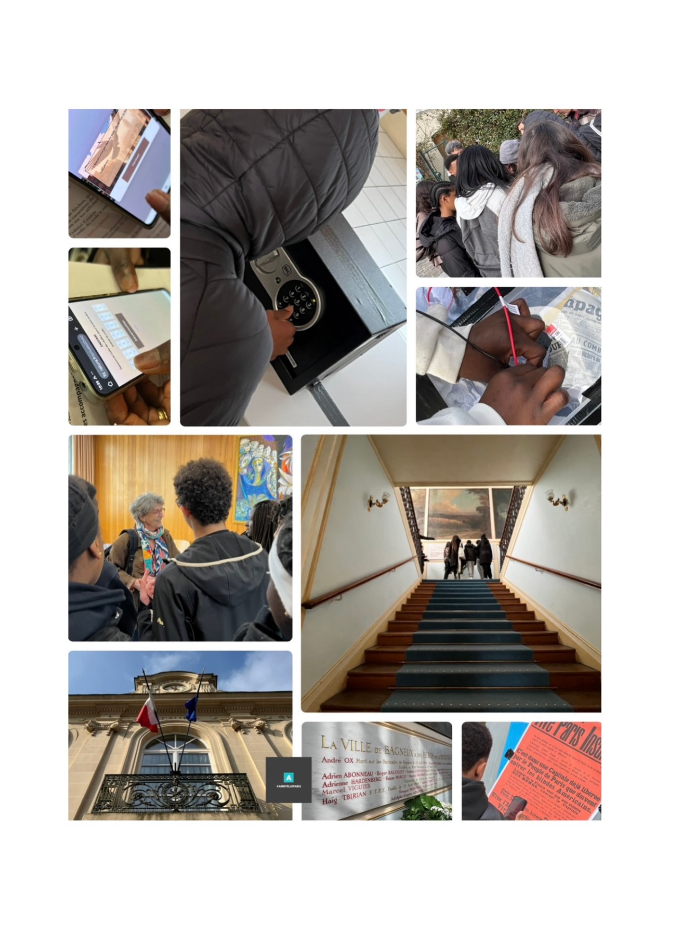 Mardi 25 mars au matin, ce sont douze groupes de huit-neuf élèves de troisième du collège Joliot-Curie, toujours accompagnés d’un adulte, qui ont parcouru un circuit en sept étapes pour résoudre la série d’énigmes. De la place Lucie Aubrac à l’ancien mairie en passant par la Rue Cosson et les locaux associatifs des Anciens Combattants, la stèle du Rond-point des martyrs de Châteaubriant où ils ont pu rencontrer l’association des Martyrs de Châteaubriant, la Rue du colonel Fabien, la rue de la Résistance, la place de la République. À l’ancienne mairie, les collégiens étaient attendus par Elisabeth Helfer Aubrac, la fille de Lucie et de Raymond Aubrac, résistants, avec qui ils ont pu échanger.