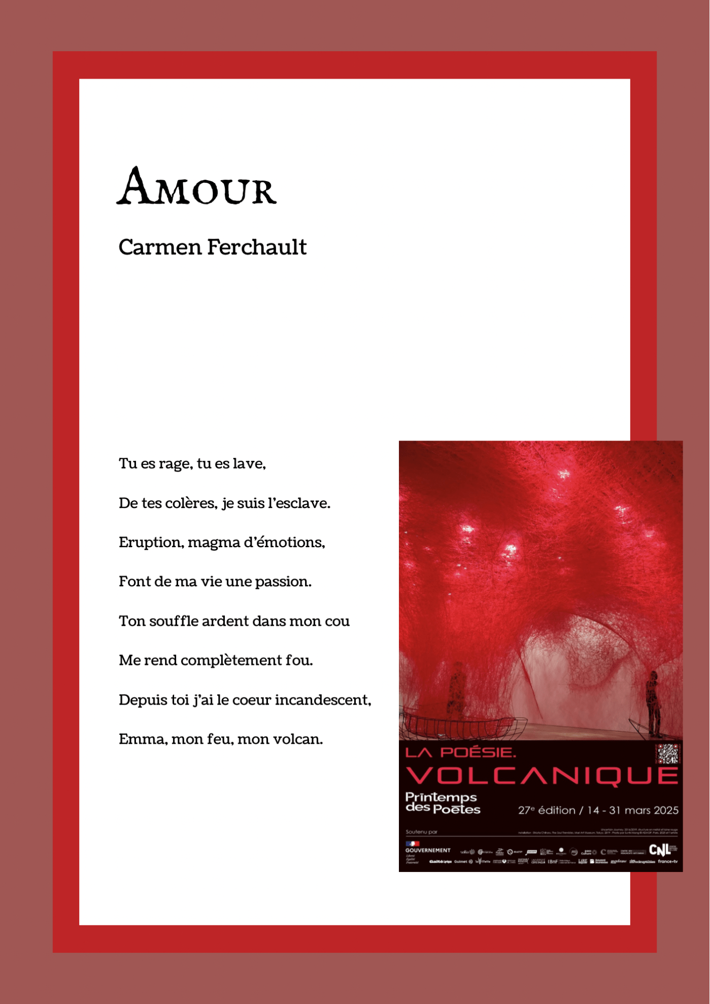 Du 14 au 31 mars 2025, s’est déroulé dans toute la France le 27e Printemps des Poètes. Cette nouvelle édition portait sur « La Poésie. Volcanique ». Le Printemps des Poètes est soutenu par le Ministère de la Culture, le Centre national du Livre et de nombreux partenaires.