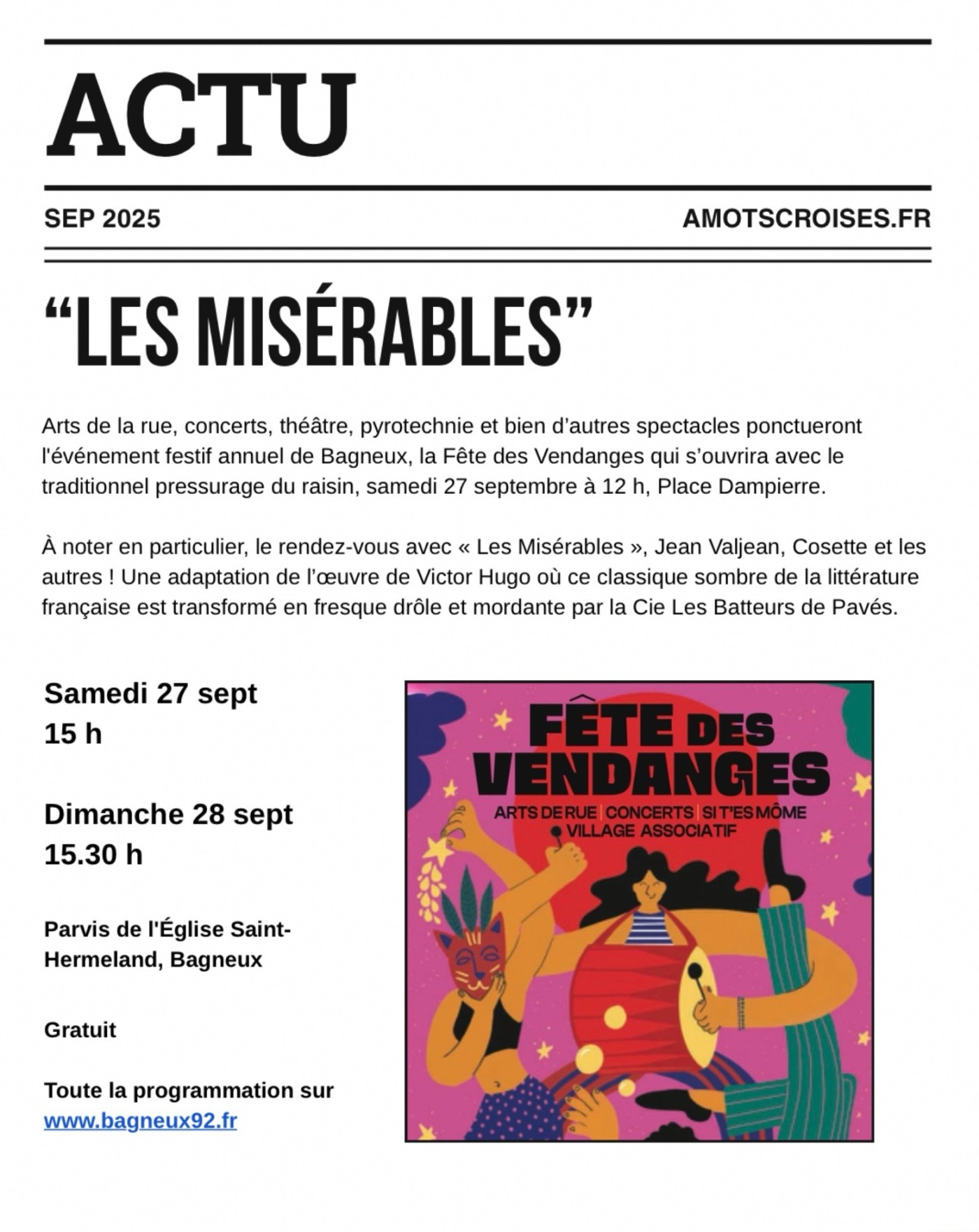 Arts de la rue, concerts, théâtre, pyrotechnie et bien d’autres spectacles ponctueront l’événement festif annuel de Bagneux, la Fête des Vendanges qui s’ouvrira avec le traditionnel pressurage du raisin samedi 27 septembre 2025 à 12 h, Place Dampierre.