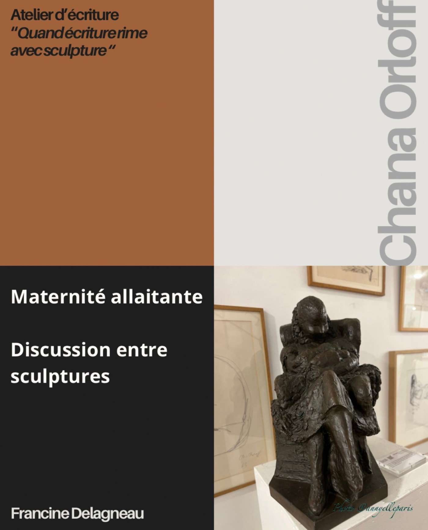 Confortablement assise dans un fauteuil, mon enfant au plus près de moi, peau contre peau, tète goulûment mon sein. Des visiteurs ! Mais je n’attendais personne. Ils s’approchent, tournent autour de nous, penchent leur tête à presque nous toucher. Voyons, soyez corrects. Arrêtez de nous regarder, vous ne comprenez pas que c’est un moment à moi avec mon bébé, un moment de pur bonheur et d’intimité. Vos regards scrutateurs me gênent. J’aimerais pouvoir savourer cet allaitement pendant des années, des siècles. Mais ! Suis-je bête ! L’artiste m’a sculptée depuis plus de cinquante ans. J’ai le droit de jouir éternellement de ce merveilleux temps d’amour. Et vous, de m’admirer tout votre loisir, de me photographier sous tous les angles et de me décrire à vos amis. C’est ma vie, ma vie de sculpture de Chana Orloff.