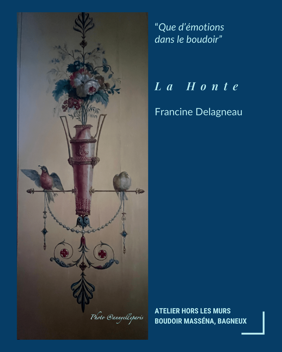 Pour Francine : « Après la montée raide d’une volée de marches et le passage du seuil de la porte d’une petite pièce carrée, c’est la découverte. Un sol recouvert d’un parquet ancien et grinçant, mais ciré avec soin, des murs bleus parés de peintures à l’antique, une cheminée de marbre trônant au milieu avec son miroir. Mes yeux parcourent ces panneaux un à un et restent en admiration, de la délicatesse des bouquets floraux, de la transparence des ailes des libellules, des traits fins dessinant les vases, des couleurs des oiseaux et des boucles de la chevelure châtain de ce visage inconnu. J’écoute la petite histoire étonnante de la bâtisse et de ses habitants plutôt éclectiques. Cette jolie frimousse serait celle d’Eugénie Renique, jeune danseuse à l’opéra, devenue la maîtresse du Général Masséna. Il lui offrit cette maison où ils se retrouvaient et menaient une vie tranquille de couple. Dans ce boudoir, elle a sûrement lu les romans à la mode, reçu des invités pour le thé, avoir eu des causeries discrètes et a attendu patiemment le retour de son bien-aimé. J’aurais aimé être présente, écouter leurs conversations et tenir avec l’artiste, le pinceau qui dessina les lignes élégantes de ces belles plumes de paon. »