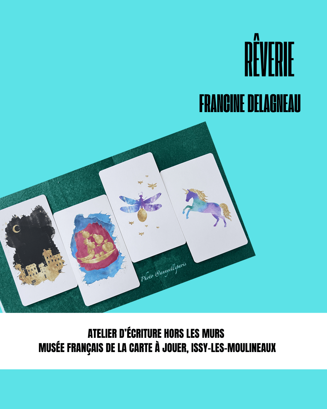 Rendez-vous d’écriture autour de « La mécanique des cartes » ! Après la visite guidée du Musée français de la Carte à jouer à Issy-les-Moulineaux, Annie Lamiral, intervenante À Mots croisés, a invité chaque écrivant à tirer quatre cartes d’oracle*. Puis, elle les a invités à se laisser porter par les dessins, les couleurs, les formes pour imaginer un oracle intuitif à partir des vibrations ressenties ou pour créer une histoire inspirée par leurs cartes, selon leurs propres énergies.