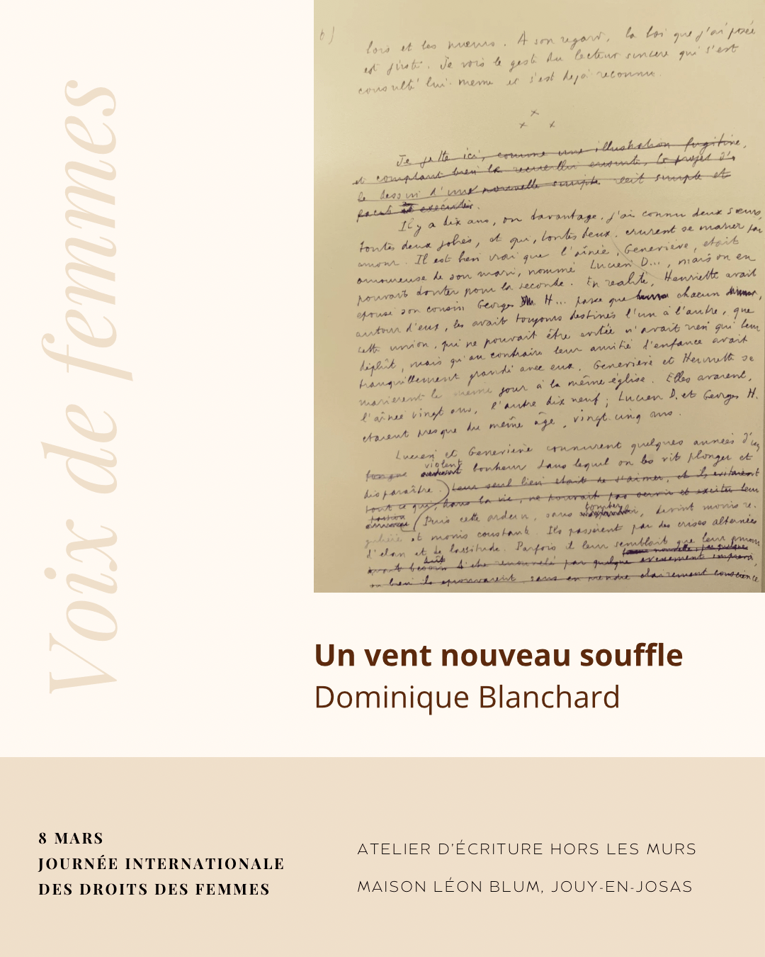 À suivre, le récit imaginé par Dominique, lors de l’atelier « Voix de femmes » proposé par Annie Lamiral, intervenante À Mots croisés, à l’issue de la visite guidée de la Maison de Léon Blum à Jouy-en-Josas. Le temps long d’écriture était centré sur les femmes dans les années Blum.