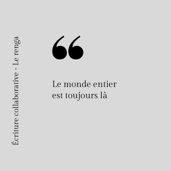 Comme expliqué dans un précédent post, nos écrivants se sont prêtés à un exercice d’écriture collaborative. Voici l’un des rengas écrit en atelier, sans contrainte (syllabique et autres). Nous publions également le poème « Tu es plus belle que le ciel et la mer » de Blaise Cendrars, dont le premier vers de la dernière strophe a... Lire la Suite →
