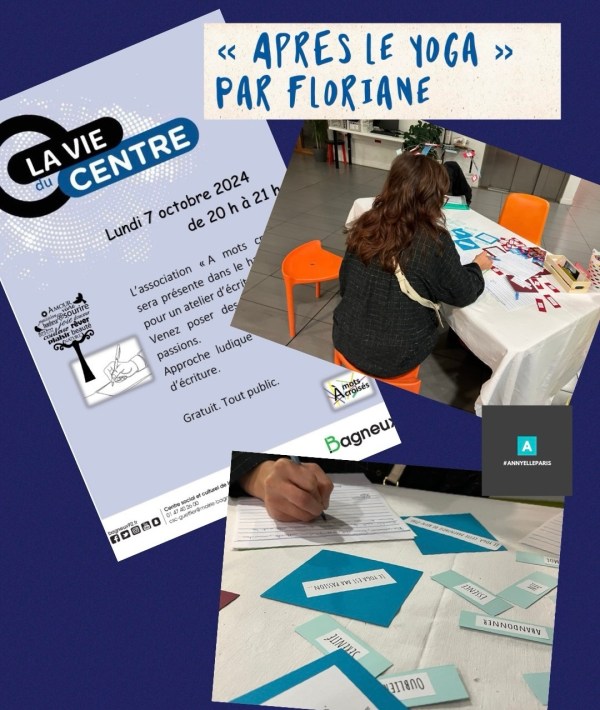 Lundi 7 octobre 2024, le Centre social et culturel Fontaine-Gueffier invitait À Mots croisés à expérimenter une approche ludique des mots auprès de ses publics, amateurs de théâtre d’improvisation et de yoga. Annie, intervenante d’A Mots croisés, a pu recueillir quelques témoignages dont ceux de Hajar et de Ténin (voir post précédent). Elle a... Lire la Suite →